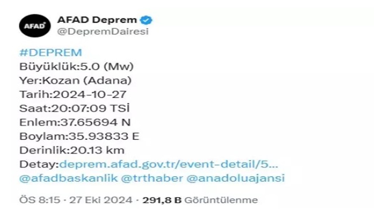 AFAD, Adana’nın Kozan ilçesinde büyüklüğü 5 olan bir deprem meydana geldiğini açıkladı. AFADdan yapılan son dakika açıklamasıyla birlikte Adana’daki depremle ilgili tüm detaylar araştırılmaya başlandı. Sarsıntıyı hisseden vatandaşlar korku ve panikle kendilerini sokağa atarken sarsıntının Adana’nın yanı sıra çevre illerden de hissedildiği öğrenildi. 27 Ekim 2024 Pazar (bu akşam) saat 20.07 sularında meydana gelen depremin yerin 20,13 kilometre derinliğinde yaşandığı kaydedildi.