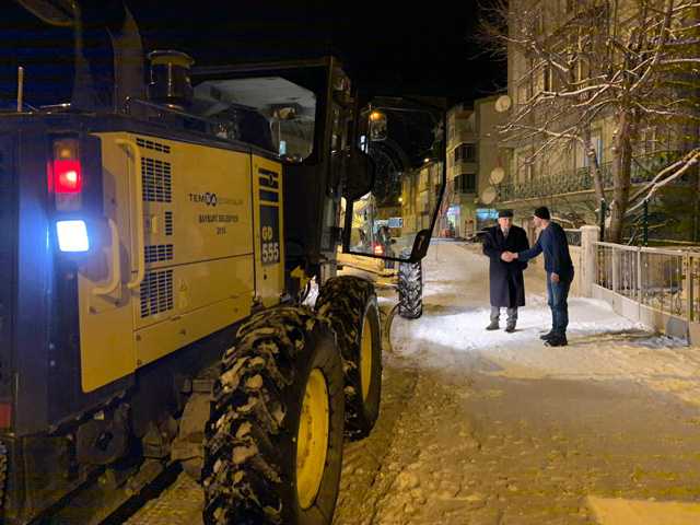 Şehir merkezinde akşam saatlerinde kar yağışının yerini rüzgarlı ve soğuk havaya bırakmasının ardından Belediye Başkanı Hükmü Pekmezci çalışmaları yerinde inceleyerek çalışmaları yürüten personellerle devamlı diyalog içerisinde bulundu.