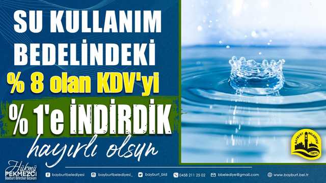 Temel gıda ürünlerindeki KDV oranlarının yüzde 8’den yüzde 1’e indirilmesinin ardından, Cumhurbaşkanı Kararı’na istinaden Bayburt Belediyesi aldığı karar ile su tüketim ücretlerindeki yüzde 8 olan KDV oranını yüzde 1’e düşürdü.