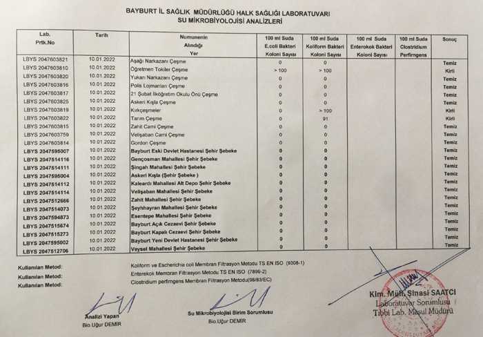Bayburt Halk Sağlığı Laboratuvarı tarafından şehir merkezinde yapılan içme sularının Ocak 2022 tarihli su analiz sonuçları aşağıda yayınlanmıştır.