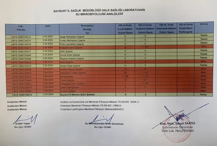 Bayburt Halk Sağlığı Laboratuvarı tarafından şehir merkezinde yapılan sokak çeşme sularının 02 Nisan 2024 tarihli su analiz sonuçları aşağıda yayınlanmıştır.