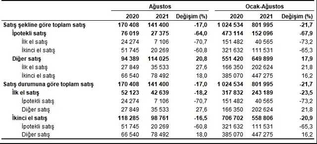 Konut satışları Ocak-Ağustos döneminde bir önceki yılın aynı dönemine göre yüzde 21,7 azalışla 801 bin 995 olarak gerçekleşirken ipotekli konut satışı yüzde 67,9 azalışla 152 bin 96, diğer satış türleri ise yüzde 17,9 artışla 649 bin 899 oldu. Bu dönemde ilk defa satılan konutlar yüzde 23,5 azalışla 243 bin 189, ikinci el konut satışları yüzde 20,9 azalışla 558 bin 806 olarak gerçekleşti.