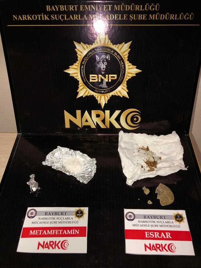 Bayburt İl Emniyet Müdürlüğü Narkotik Suçlarla Mücadele Şube Müdürlüğü ekiplerince, alınan ihbar üzerine şehir merkezi girişinde uygulama noktasında durdurulan 2 ayrı araçta yapılan aramalarda metamfetamin ve esrar maddesi ele geçirildi.