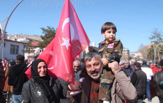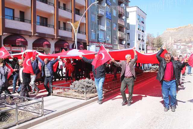 Cumhuriyet Caddesi boyunca açılan dev Türk bayraklarıyla “Her Türk Asker Doğar”, “Şehitler Ölmez Vatan Bölünmez” sloganlarıyla yürüyen kalabalık Askerlik Şubesi önüne gelerek asker selamı verdiler. Burada saygı duruşunda bulunan kalabalık İstiklal Marşını okundu.