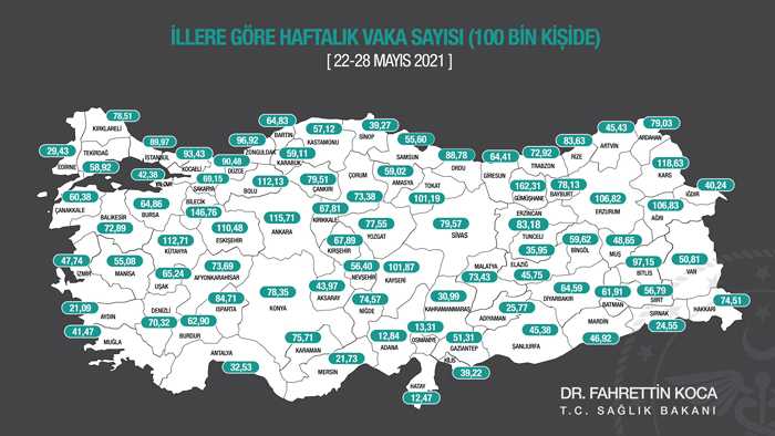 Sağlık Bakanı Fahrettin Koca, 22-28 Mayıs arasında illere göre her 100 bin kişide görülen korona virüs vaka sayılarını açıkladı. Bayburt’ta vaka sayısı 100 bin kişide 78,13 oldu.