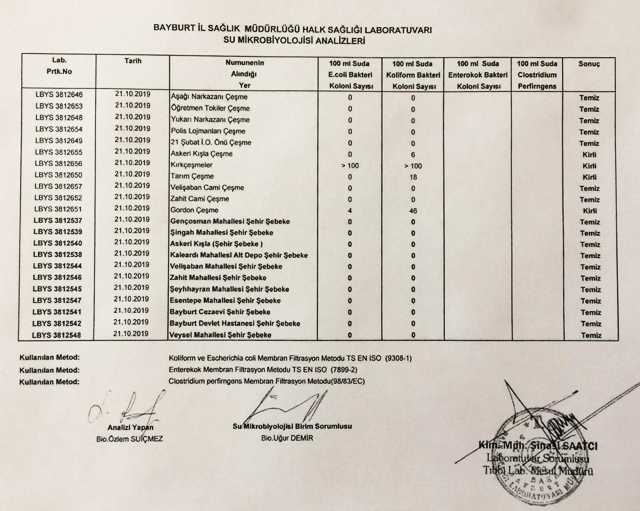 Bayburt Halk Sağlığı Laboratuvarı tarafından şehir merkezinde yapılan içme sularının 2019 Ekim ayı analiz sonuçları aşağıda yayınlanmıştır.