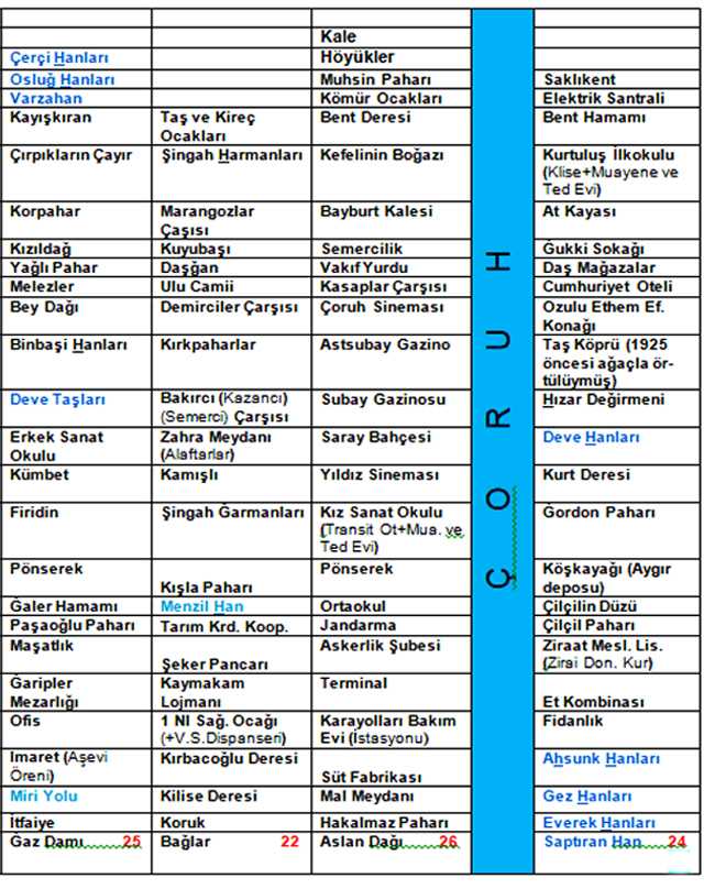 Bayburt Merkezi için belirleyebildiğim “Eski Yapı ve Mevkiler” Nehre göre dizilirken,