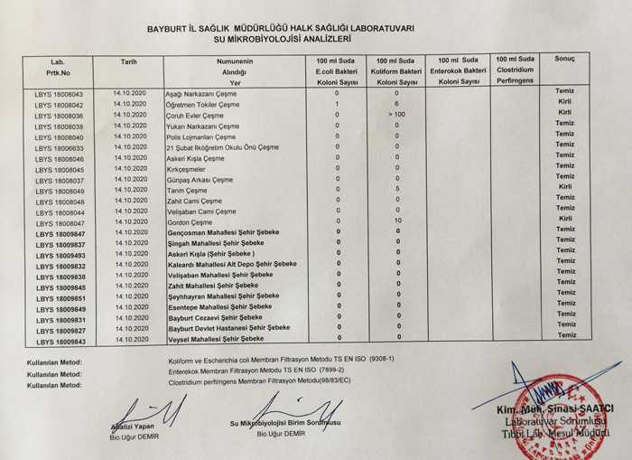 Bayburt Halk Sağlığı Laboratuvarı tarafından şehir merkezinde yapılan içme sularının 14 Ekim tarihli su analiz sonuçları aşağıda yayınlanmıştır.