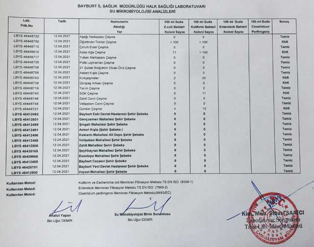 Bayburt Halk Sağlığı Laboratuvarı tarafından şehir merkezinde yapılan içme sularının 12 Nisan 2021 tarihli su analiz sonuçları aşağıda yayınlanmıştır.
