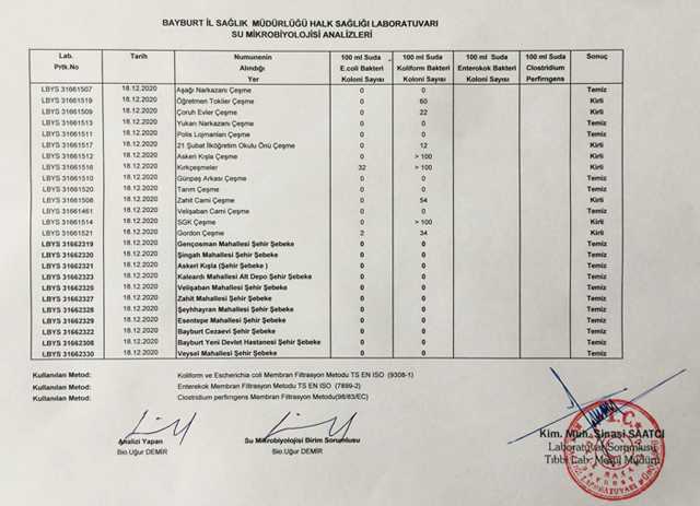 Bayburt Halk Sağlığı Laboratuvarı tarafından şehir merkezinde yapılan içme sularının 18 Aralık tarihli su analiz sonuçları aşağıda yayınlanmıştır.
