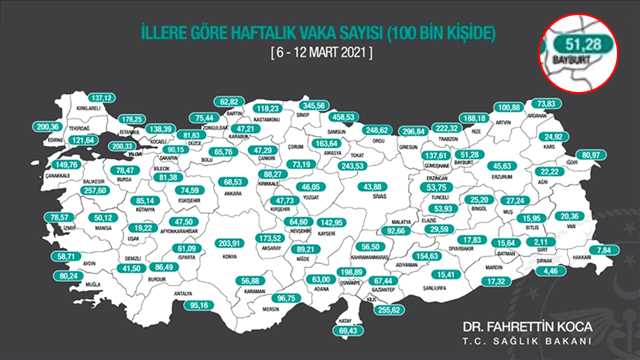 Türkiye’de 81 İlde her 100 bin kişide görülen koronavirüs vaka oranlarında 6-12 Mart tarihindeki haftalık tablo belli oldu. Buna göre son hafta tablosunda Bayburt’ta vaka sayısı yükselerek 100 bin kişide 51,28’e yükseldi.