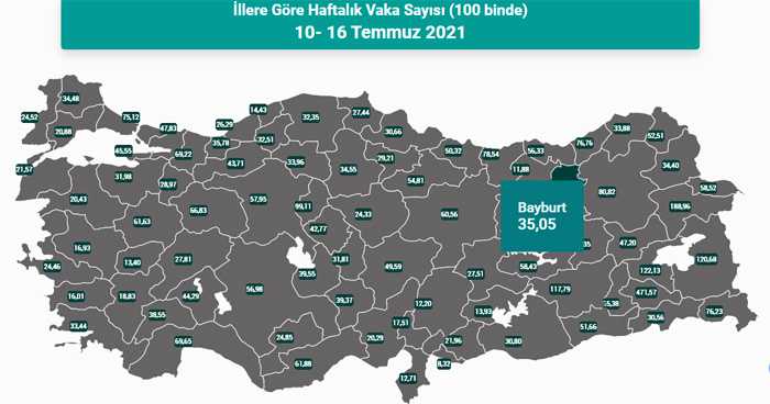 Bir hafta önce 3-9 Temmuz’da Bayburt’ta her 100 bin kişide görülen vaka sayısı 19.53’den, artış göstererek 35.05’e yükseldi ve bir haftada vaka sayısı yüzde seksen artış gösterdi.