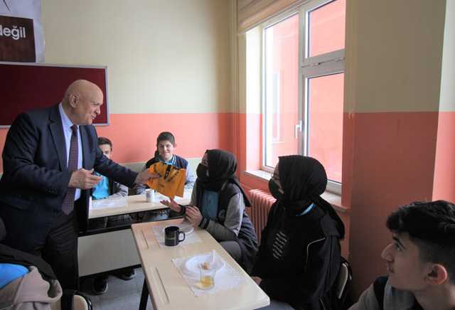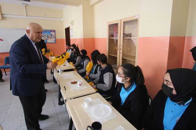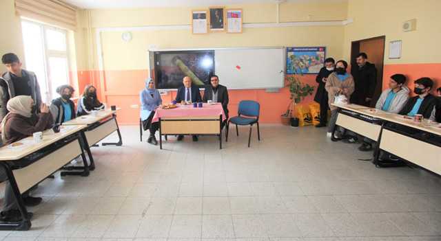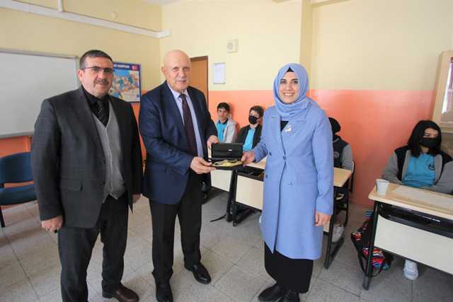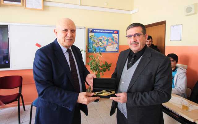 Okul Müdürü Ali Şahin ve matematik öğretmeni Zühre Topuz’a misafirperverliklerinden dolayı teşekkür eden Pekmezci kalem ve kitap takdim etti.