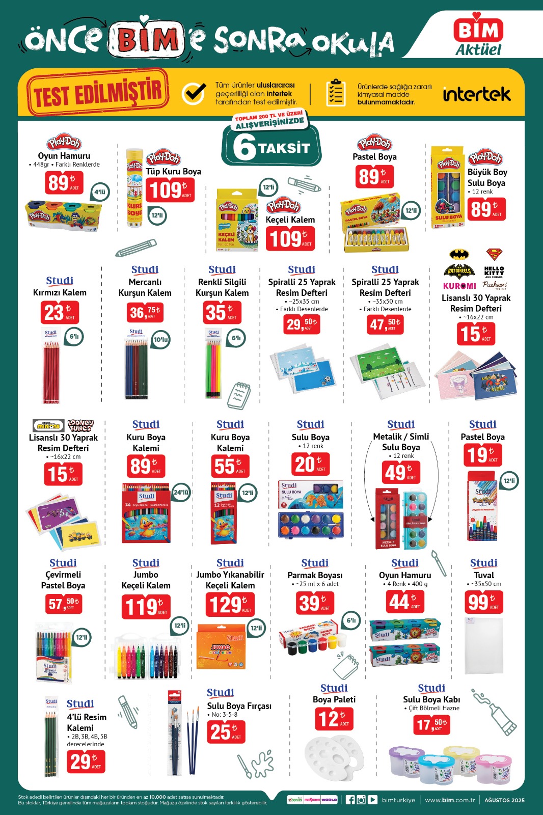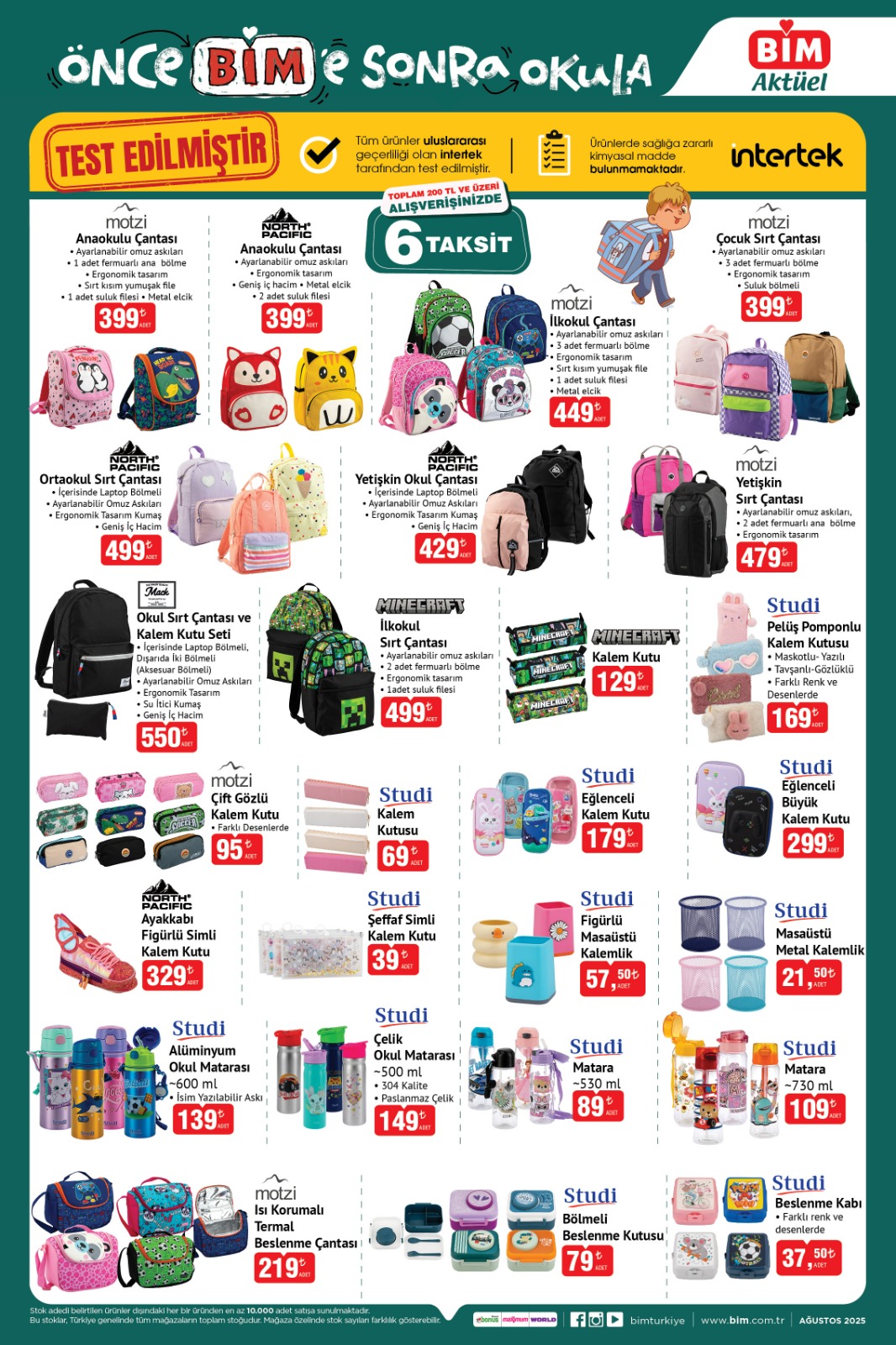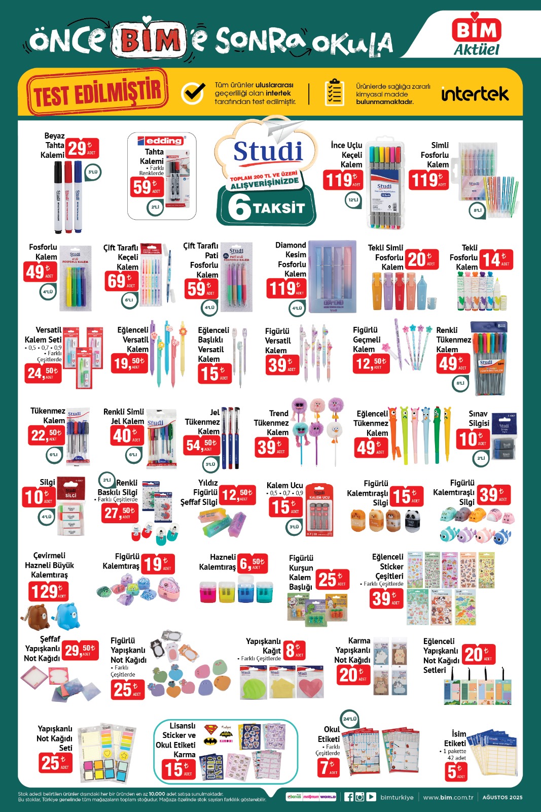 Yeni eğitim-öğretim yılı öncesi BİM marketleri, geniş ürün yelpazesiyle dikkat çekiyor. Test edilmiş ve sağlığa zararlı kimyasal madde içermeyen ürünleriyle öne çıkan kampanya kapsamında; defter, kalem, boya setleri, okul çantaları ve aksesuarlar satışa çıkarıldı. Ayrıca 200 TL ve üzeri alışverişlerde 6 taksit imkanı sunuluyor.