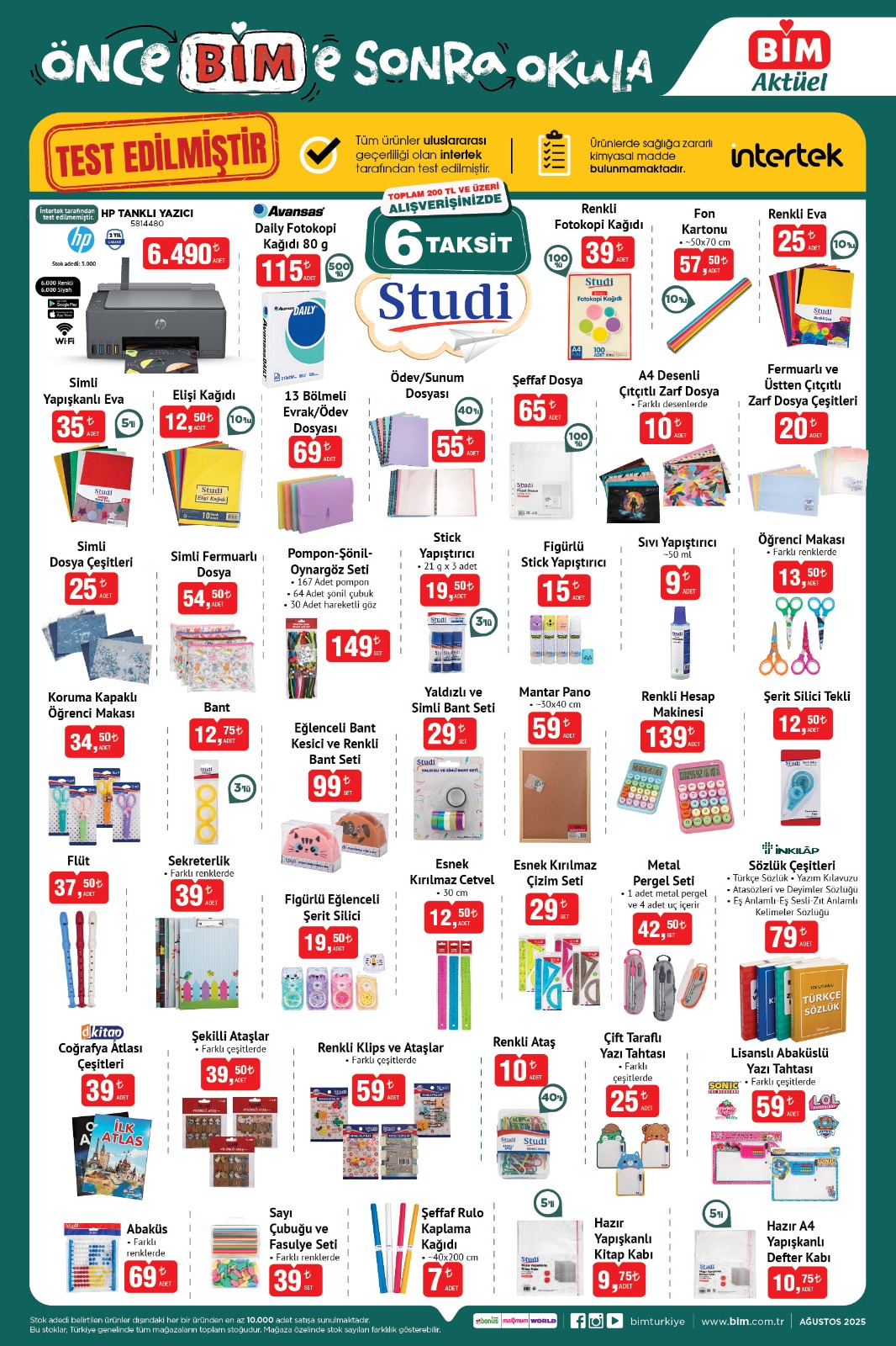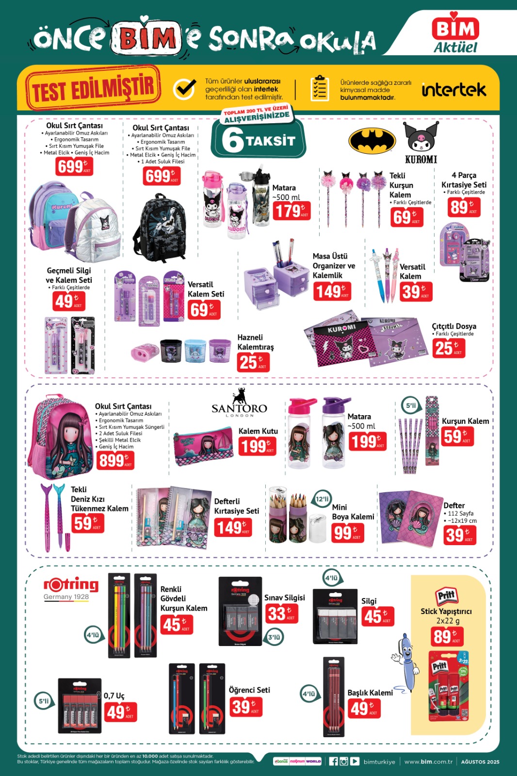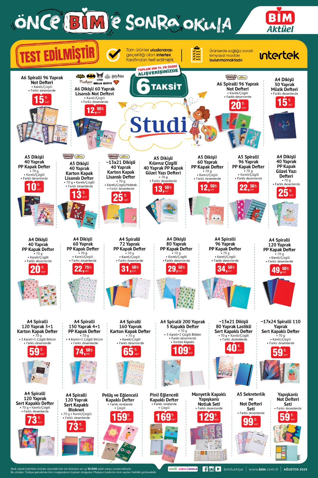Yeni eğitim-öğretim yılı öncesi BİM marketleri, geniş ürün yelpazesiyle dikkat çekiyor. Test edilmiş ve sağlığa zararlı kimyasal madde içermeyen ürünleriyle öne çıkan kampanya kapsamında; defter, kalem, boya setleri, okul çantaları ve aksesuarlar satışa çıkarıldı. Ayrıca 200 TL ve üzeri alışverişlerde 6 taksit imkanı sunuluyor.