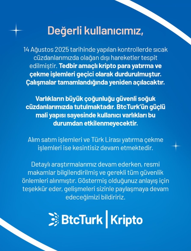 Türkiye’nin önde gelen kripto para platformu BtcTurk, rutin kontroller sırasında sıcak cüzdanlarda şüpheli hareketler tespit etti. Bu gelişme üzerine kripto para yatırma ve çekme işlemleri durduruldu. Şirket, Türk Lirası işlemleri ile alım-satım faaliyetlerinin kesintisiz sürdüğünü, kullanıcı varlıklarının ise güvende olduğunu duyurdu.