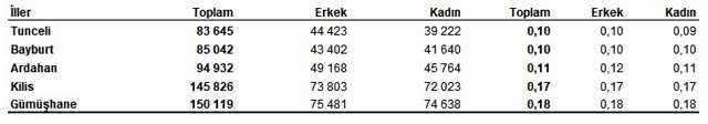 Bayburt merkezinin yeni nüfusu 48 bin 36 olarak belirlenirken, Aydıntepe’nin merkez nüfusu 3 bin 239, Demirözü’nün merkez nüfusu ise 3 bin 771 oldu.