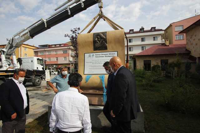 Dede Korkut rölyefi ile Korkut Ata’nın Dünya Somut Olmayan Kültür Mirası Listesi’ne girdiğine dair Bayburt Belediyesi’ne takdim edilen belgenin kopyasının da yer aldığı anıt, Saray Bahçesi’ne yerleştirildi.